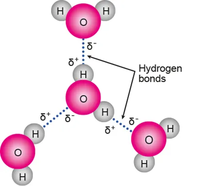 Hydrogen bonding: intermolecular force between the O and H of different H₂O molecules