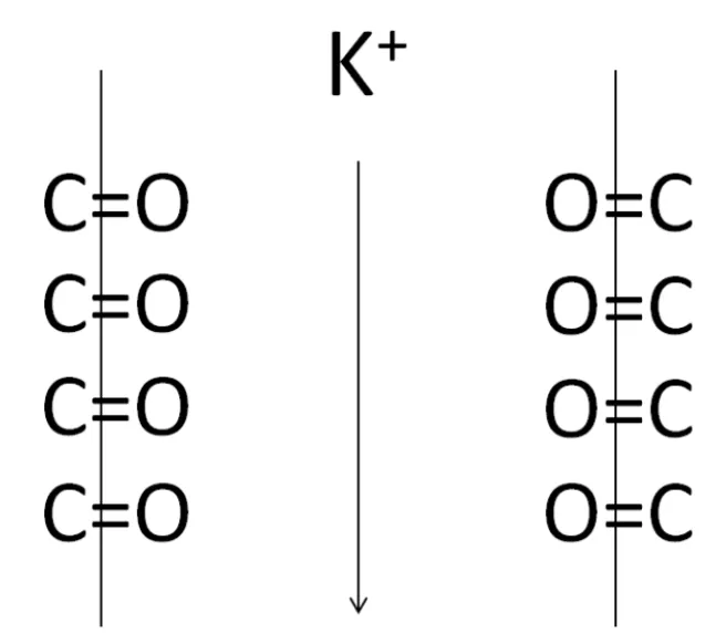 Given that the selectivity filter is lined with carbonyl oxygens, how might potassium ion channel allow potassium ion through but not sodium ion when sodium ion is smaller?