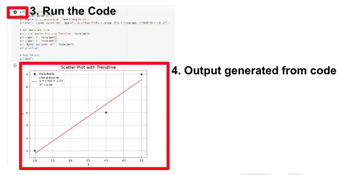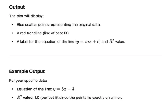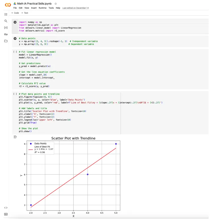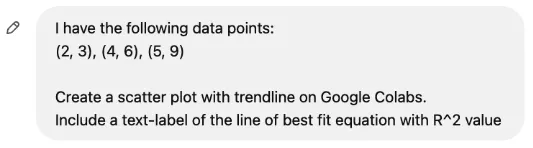 I have the following data points: (2, 3), (4, 6), (5, 9) Create a scatter plot with trendline on Google Colabs. Include a text-label of the line of best fit equation with R^2 value