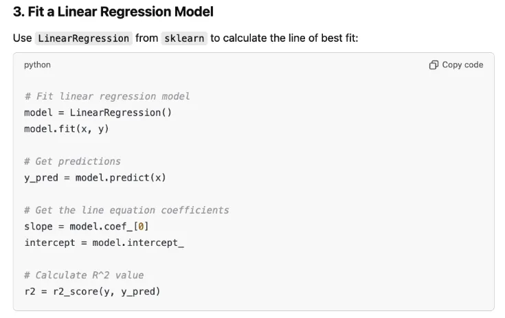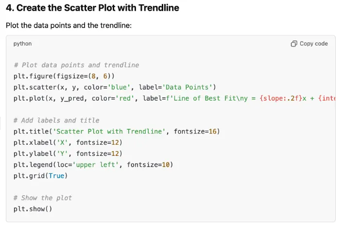 Describe the type of graph or visualization you need (e.g., "Create a scatter plot with a trendline") and get Python code that uses libraries like Matplotlib or Seaborn.
