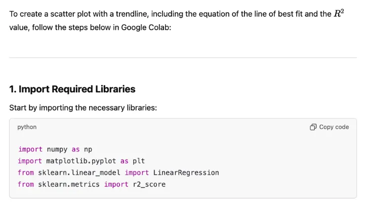 Even if you're not familiar with Python syntax, you can describe your requirements or tasks in plain language and receive code suggestions that can be directly copied into a Colab notebook.