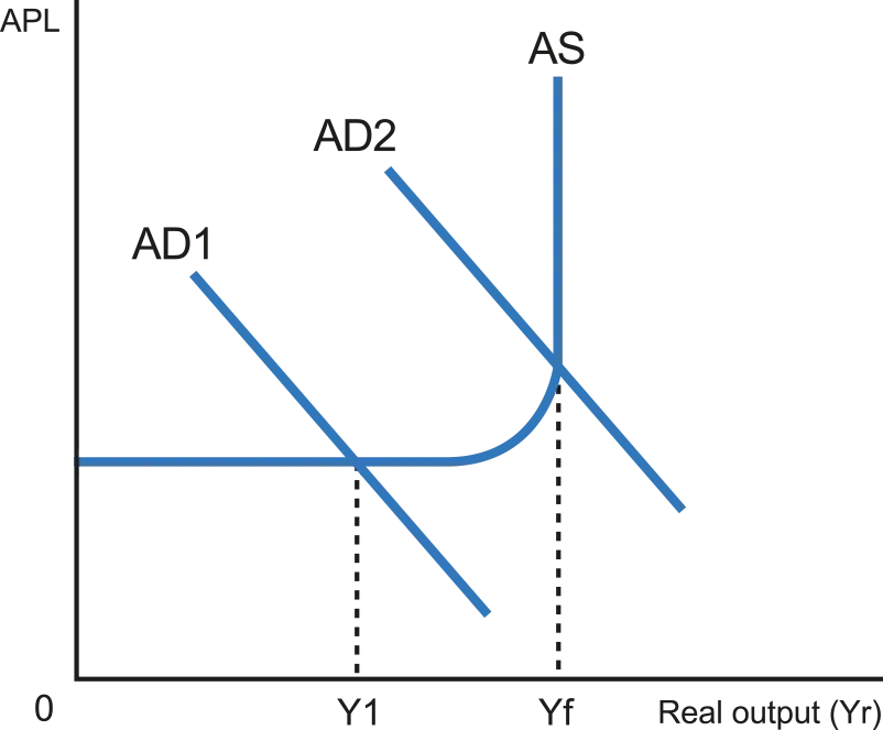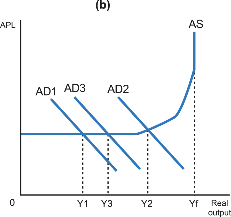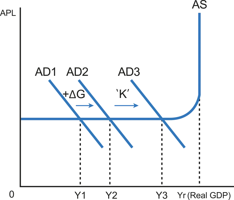 Economy is initially at income below the full employment level (Y1) → deflationary gap (Y1Yf) → AD ↑ (AD1 → AD2) → multiplier effect → AD further ↑ (AD2 → AD3) → deflationary gap ↓ (Y1Yf → Y3Yf).