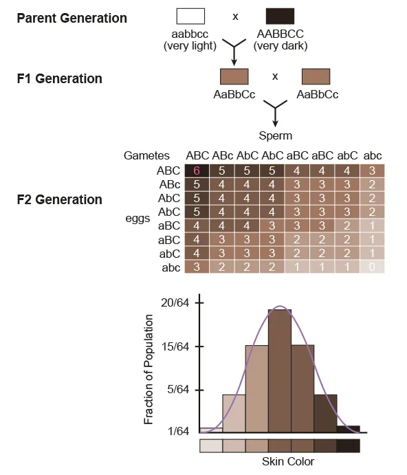 Combination of alleles determines the phenotype → continuous variation of skin color