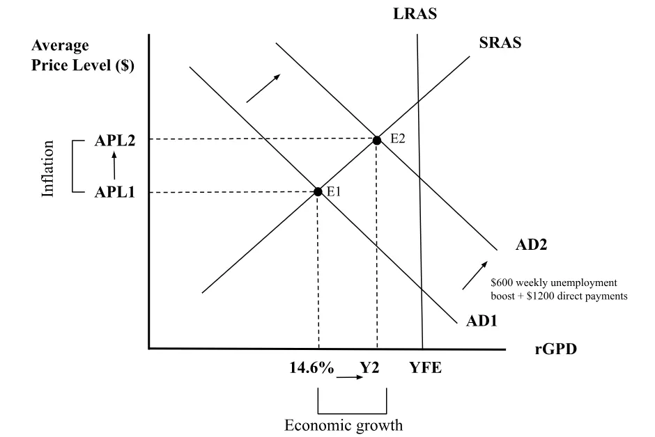 The expansionary fiscal policy in response to COVID-19 helped reduce unemployment and increase demand, shown by the rightward shift in the aggregate demand curve (AD1 to AD2) and a rise in price levels from APL1 to APL2. This effect is linked to the Phillips Curve, where lower unemployment might come with higher inflation.