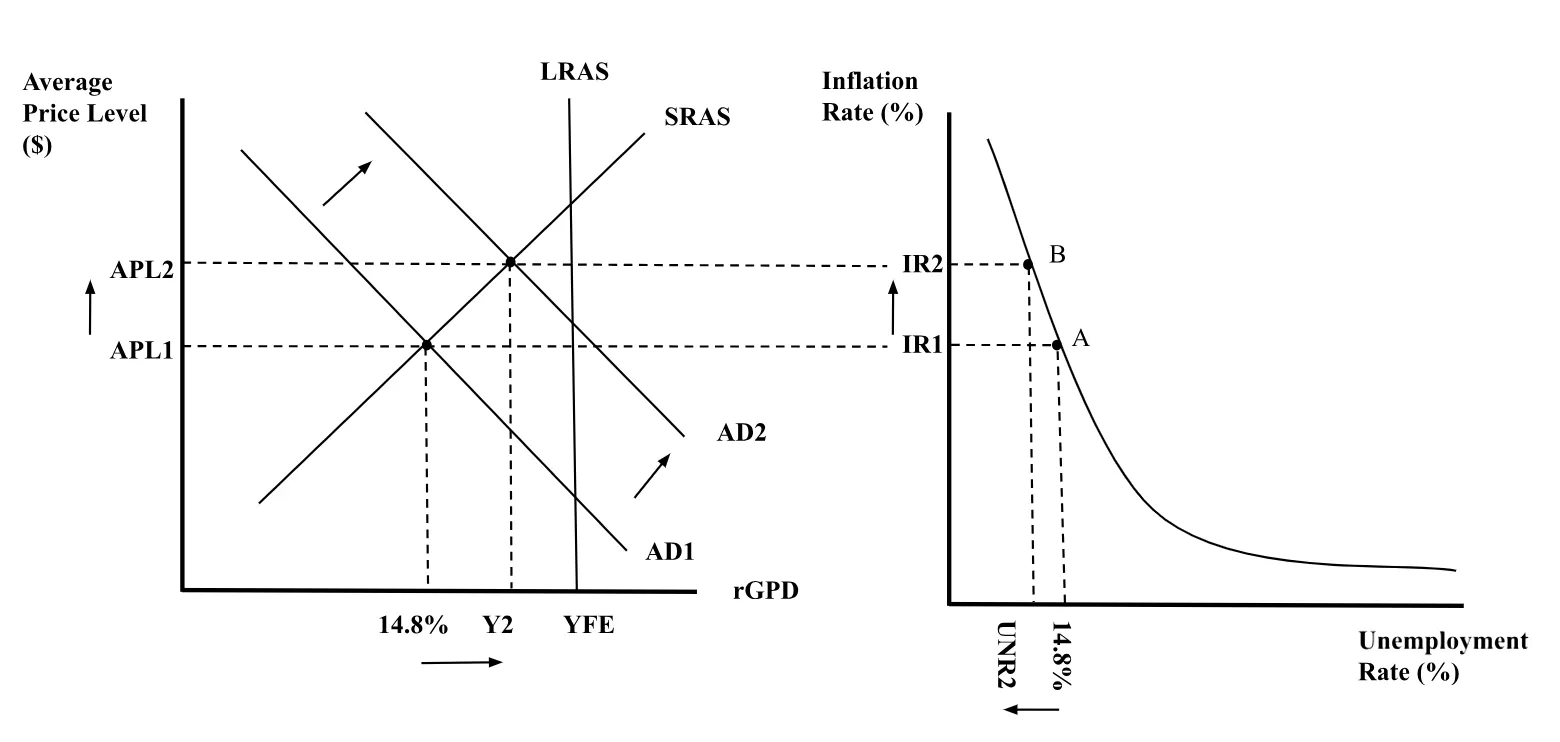 However, there are long-run consequences to this policy. The Phillips Curve suggests that, in the long run, the economy adjusts, and the trade-off between inflation and unemployment diminishes as expectations of inflation rise. This leads to higher inflation without further reductions in unemployment. As shown in Figure 2, this shift to a higher point on the Phillips Curve from IR1 to IR2, from point A to point B and while unemployment rate to decreases from 14.8% to UNR2, this represents an economy experiencing inflation with a decrease in unemployment. illustrating the limits of expansionary fiscal policy in the long run.