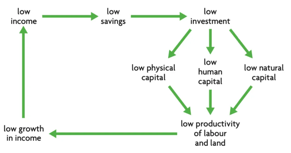 Low-qualityLow quality human capital → low productivity → low incomes → low tax revenue / corrupt government → minimal spending on public goods → poor education and healthcare system.