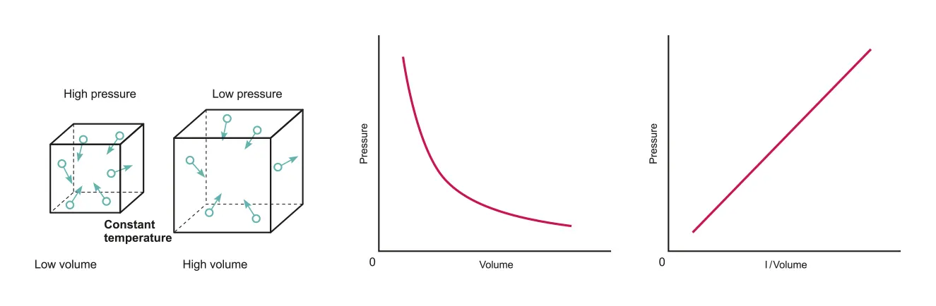 B.3.1-1 Diagram of particles in high and low pressure and graph that represents the relationship between volume and pressure