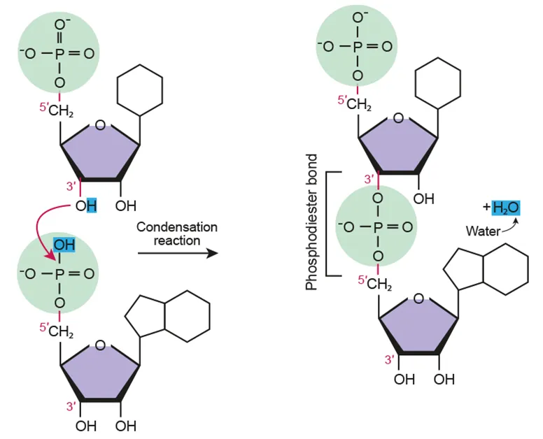 Nucleotide monomers are linked together into a polymer by a condensation reaction: