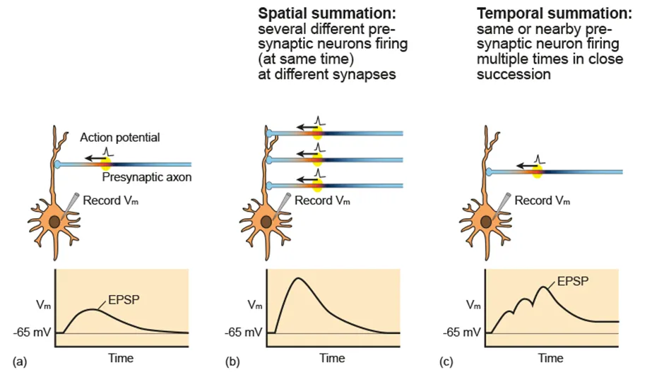 Stimulation of an action potential as a result of multiple releases of excitatory neurotransmitter