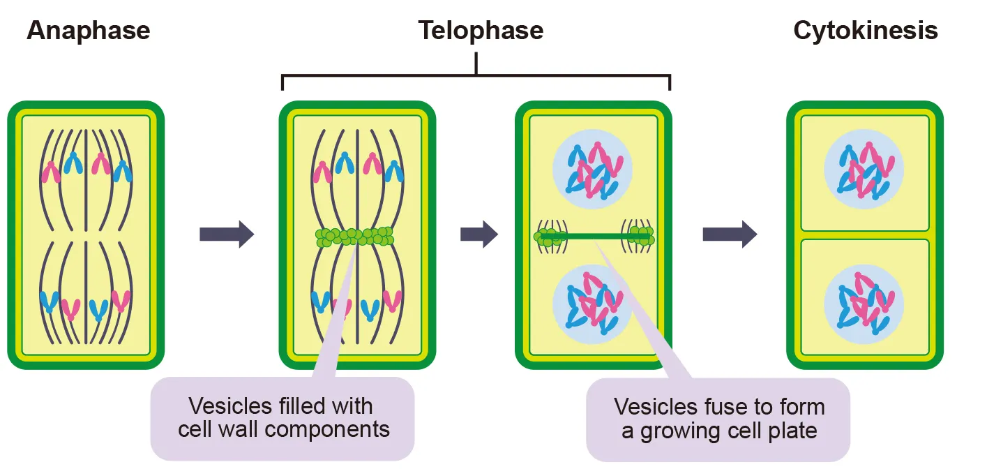 Vesicles line up at the equator and merge to form a continuous wall which becomes the plasma membrane, then carry cellulose and release it to the extracellular space via exocytosis