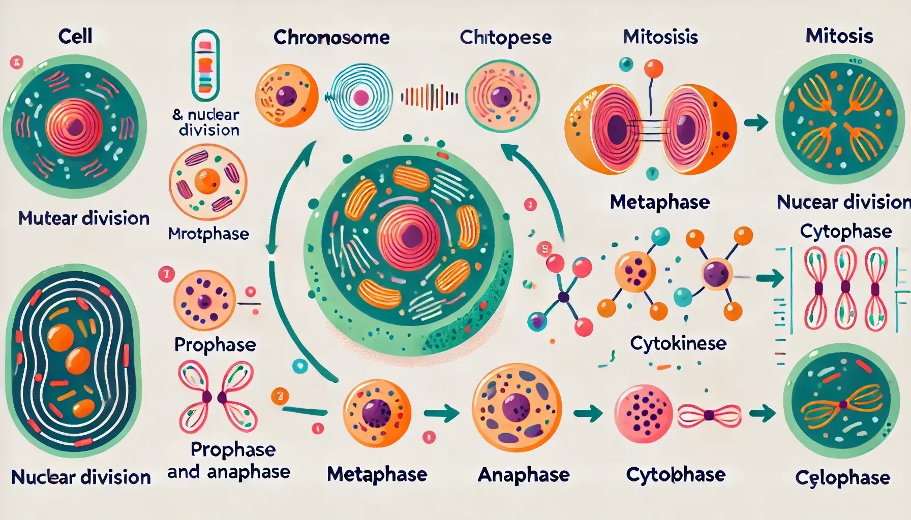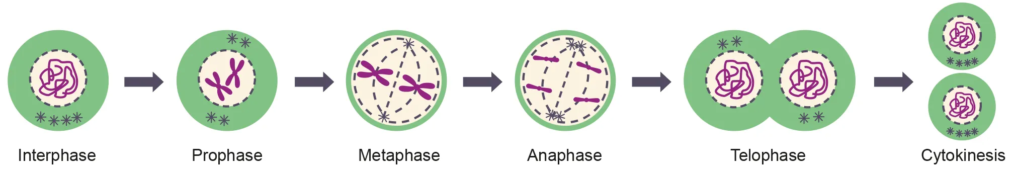 Interphase → Mitosis [prophase → metaphase → anaphase → telophase] → Cytokinesis
