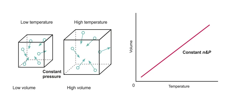B.3.1-2 Diagram of particles at low temperature and high temperature and graph representing relationship between volume and temperature