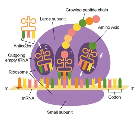 Large subunit: 3 binding sites (A,P E) for tRNA