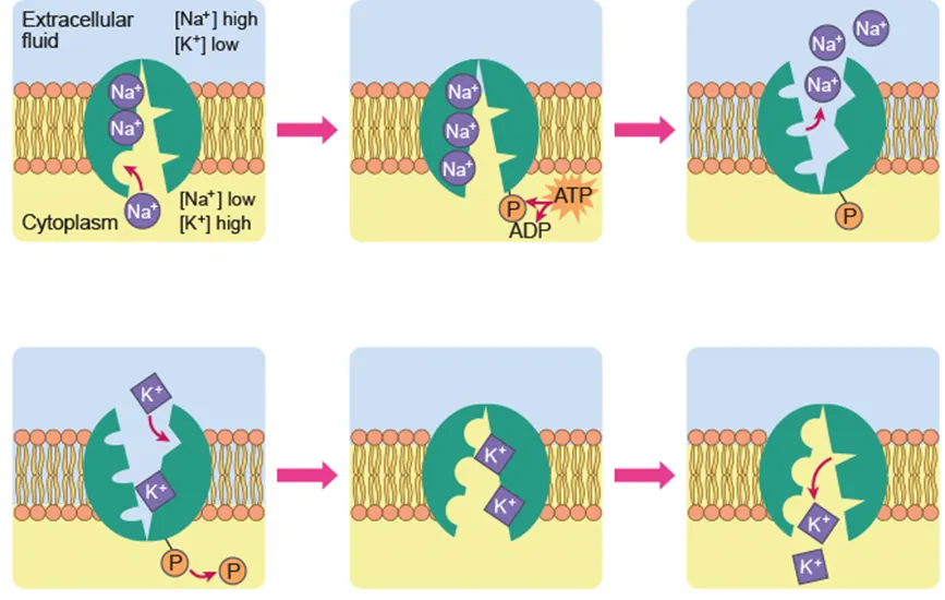 Uses ATP to transport 3Na⁺ out, 2K⁺ in
