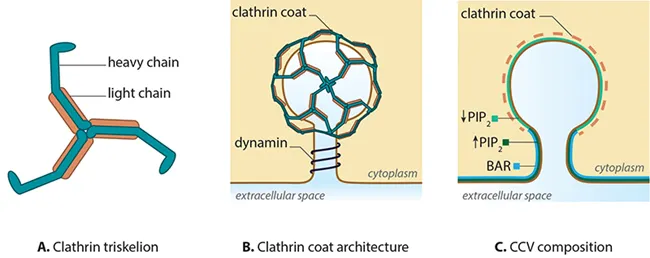 Clathrin: 3-legged protein that assembles to form a spherical cage around a piece of membrane