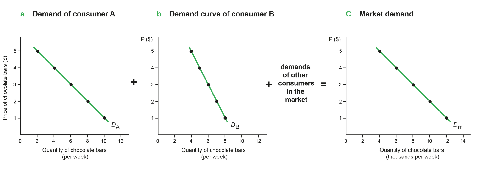 In a market of two buyers, market demand = individual D of buyer 1 + individual D of buyer 2.